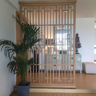 A bespoke screen was commissioned in order to define the entrance, and the transition between spaces was carefully considered. To add colour (the tenancy agreement did not allow for colour painted walls) a large display unit was designed for one side of the living room with a grey gloss back.